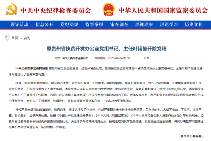 据贵州省纪委监委2月4日通报,经贵州省委批准,贵州省纪委监委对原贵州省扶贫开发办公室党组书记、主任叶韬严重违纪违法问题进行了立案审查调查。